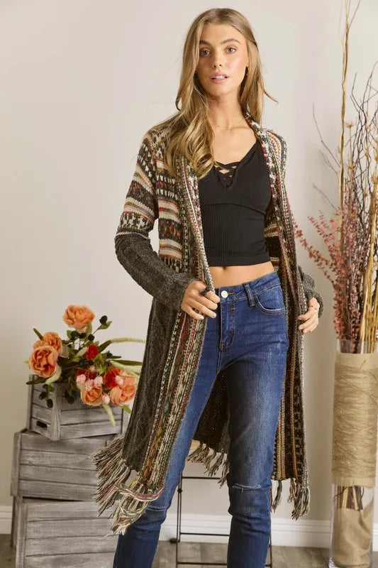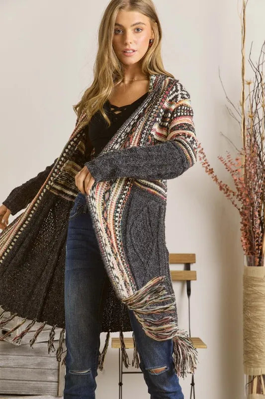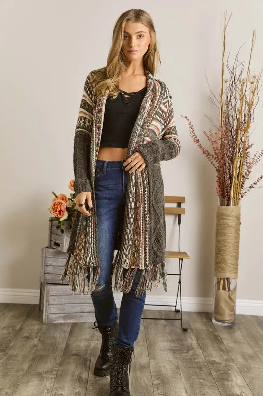 The Fringe Hem Aztec Cardigan is a stylish and bohemian-inspired piece featuring an Aztec pattern and fringe hem detailing. This cardigan adds a touch of tribal flair to your outfit while providing a cozy and chic layering option. The fringe hem adds movement and texture, making it a versatile and eye-catching addition to your wardrobe for a stylish and relaxed look.