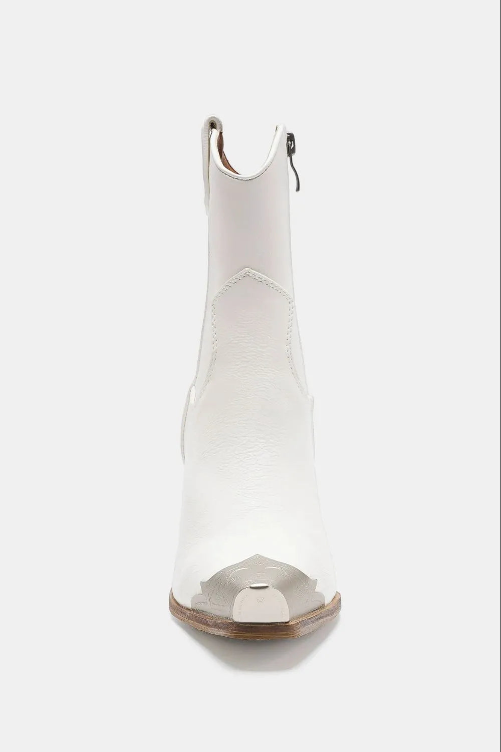 The boots bring a modern twist to the classic western style, featuring a striking metal toe cap and sleek silhouette. The stacked leather heel offers comfort and style, making these boots perfect for a bold and confident look. A side zipper allows for easy wear, while the pointed toe and intricate detailing add a fashionable edge.